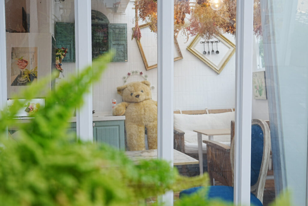 大片的玻璃櫥窗為室內引進良好採光。甚至可以看見有一隻可愛程度與它體型同等的巨大絨毛熊坐在店裡等你光臨,現在只消推開以黑色金屬巨大匙叉為門把的白色門扇踏入,就能享有悠哉療癒的用餐體驗。
