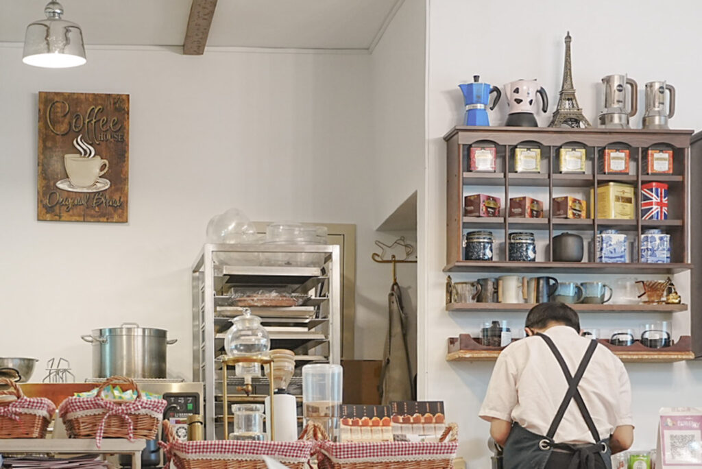 看見店內白色的牆面、桌面或椅背,以及多種飾品及雜貨都有著柔和的花卉裝飾與精緻的線條,並搭配各種粉嫩優雅的色調,都叫人想起精緻的法式雜貨風。在櫃台與甜點櫃後方的牆上,釘著實木杯架,在那些分格之中,整齊排列著各式各樣的茶壺與杯盤組,叫人目不暇給。