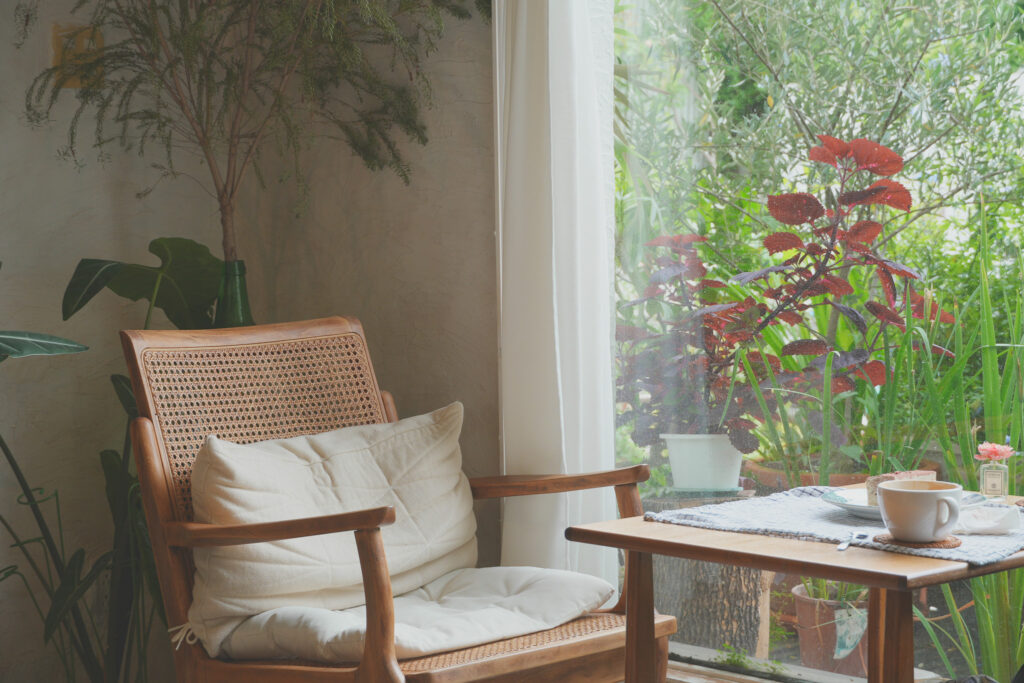 不論晴雨都有滿版窗景可以欣賞,在午後日光下更顯嬌豔的花草,被搖晃樹影所以組構的斑斑光點圍繞;抑或聆聽雨水將塵埃濾淨的聲響,看那枝葉在灰濛中卻顯得翠綠潔淨。