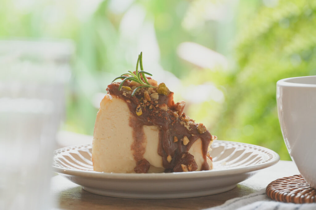 花園提拉米蘇是將茶葉磨成粉後取代可可粉,讓提拉米蘇被雅致的茶香裹覆,再與馬斯卡朋的奶香融合;花園巴斯克則是加了滿滿的肉桂淋醬與開心果碎,我原是無法理解肉桂美味的派別,濃郁的淋醬和微融質地的起司在舌上交融,卻叫人沉醉,佐以堅果的口感,讓我重新對巴斯克有了不同的印象。