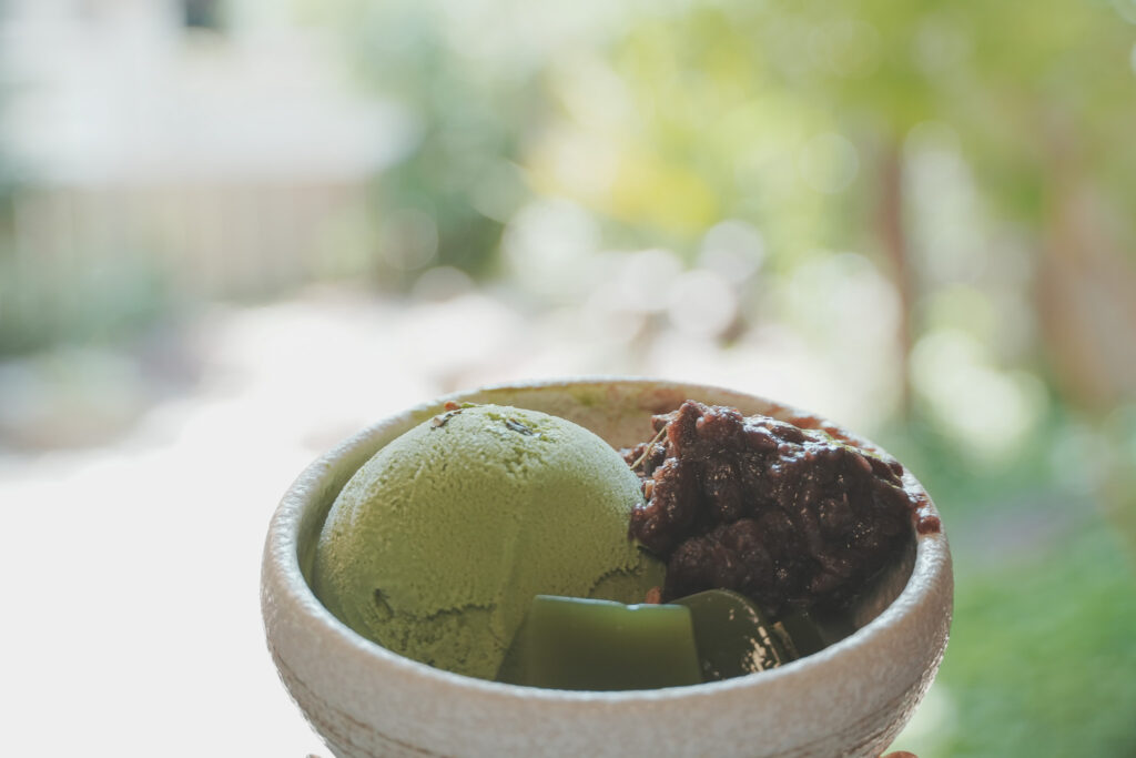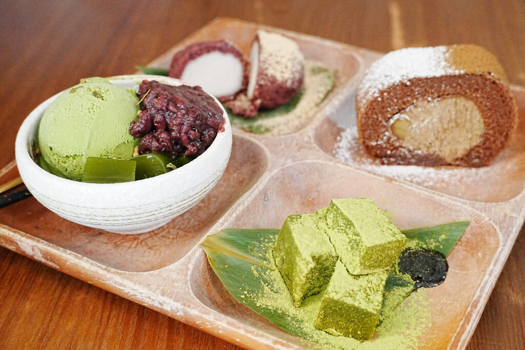想一次品嘗到最多種不同的美味,我貪心地點了京都四宮格——用紅豆餡包裹在外的萩餅、抹茶冰淇淋、抹茶蕨餅、焙茶蛋糕捲,可以將四種和風甜點都一網打盡。蕨餅和萩餅與我原本想像的口感相當不同,讓人驚訝不已。香醇的抹茶冰淇淋佐上甜蜜的紅豆泥,達成絕佳的甘苦平衡。