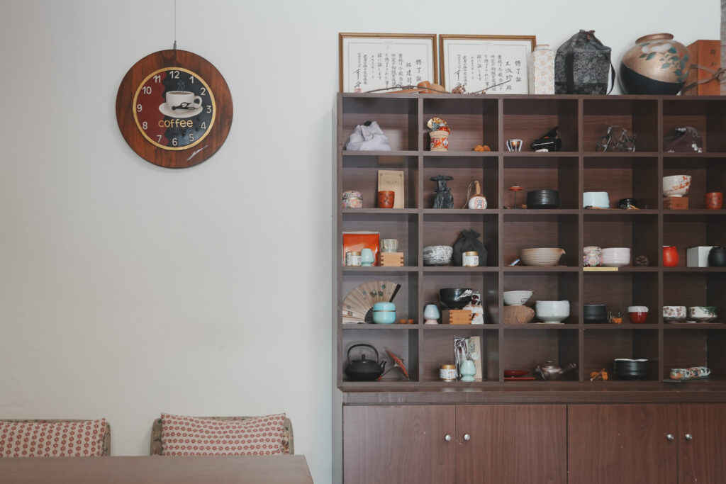 室外是日式庭園,室內的深木色裝潢卻像許多充滿歷史而令人憧憬的日式咖啡廳,將室內外的景色結合起來,便又是和洋折衷帶來的復古風格。在格子中放置著多種茶具,又有留白的空間,竟在這樣的細節中也感受到了禪意。