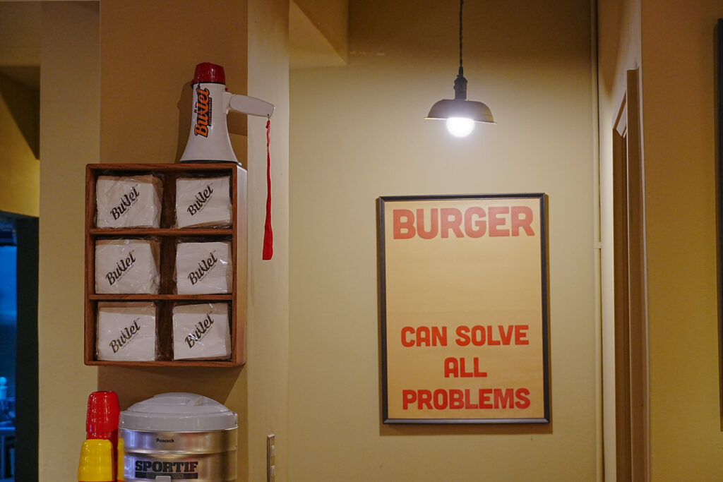 其後喝一口爽快的可樂,再吃一根沾了比例得宜胡椒鹽的薯條,充分在夜中享受美式氛圍的消夜快感,一如牆上所裝飾的英文標語——「漢堡可以解決任何煩惱」。