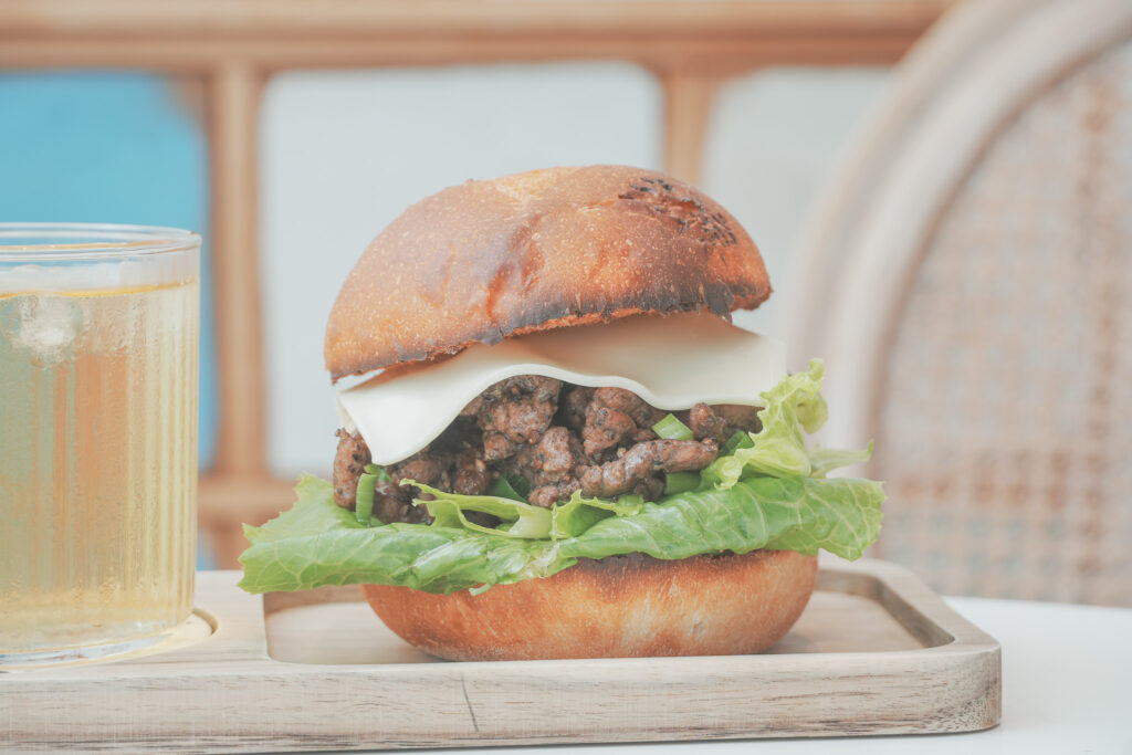 一如店名,店內的漢堡包正是使用富有嚼勁與小麥香氣的小圓法,每一顆都是手工製作的小圓法,上頭還烙有店家的LOGO,香脆乾酥的外皮被切成半圓,切面經過煎烤後,將鮮嫩的生菜葉與起司、烹飪過的肉品夾起。