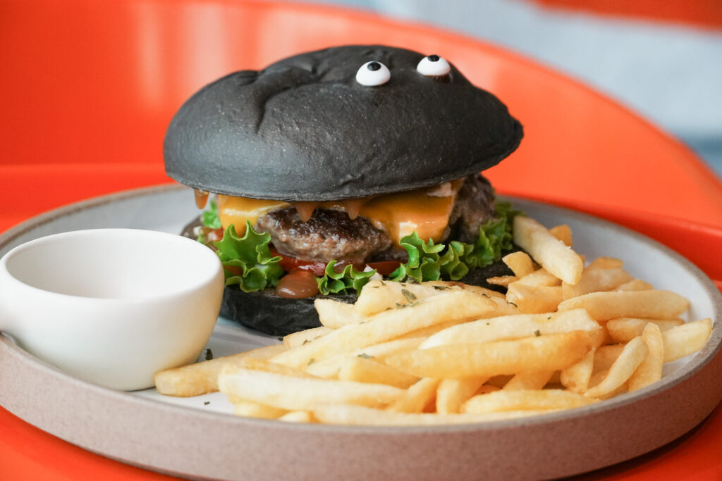 一看到菜單上的海鹽榛果牛培堡,就讓我躍躍欲試。雖然現在調整為沒有培根,但這樣的口味名稱仍令我期待不已。上桌以後,加入竹炭粉的黑色漢堡包也有一雙糖豆點綴的眼睛,讓黑色漢堡又增添了獨有的童趣。海鹽榛果醬如同牛奶糖一樣,從上層的漢堡包汩汩流下。