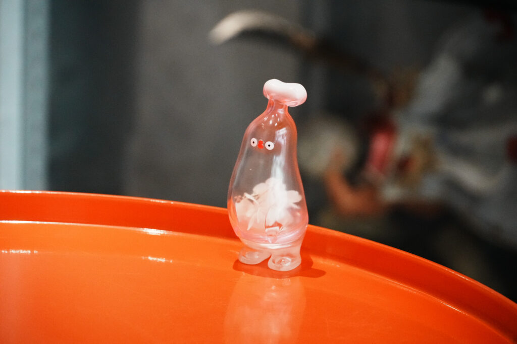 步入店內,可以見到櫃台上擺滿了玩具模型以外,還有一組玻璃展示櫃放置在門口旁,裡面同樣擺放了許多動漫人物的模型。店內是現代感的工業風。以橘色汽油桶改裝的桌子,每一桌都附了一隻同樣有雙大眼睛的玩具模型,在顧客享用漢堡之時一起會盯著看。
