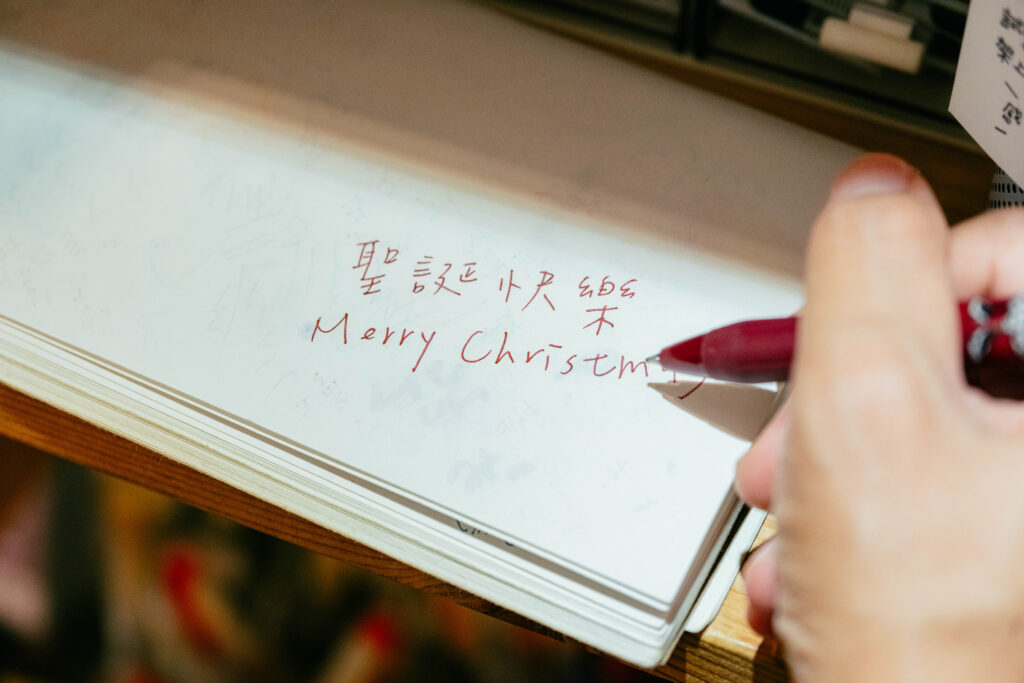 簡單的紙張也能成為萬千世界,我可以挑幾支符合手寫習慣的圓珠筆,用紅、黃、綠的佳節色彩,寫出熱鬧活潑的慶賀文字。或是選個獨特花樣的木頭印章,蓋在簽名旁作為妝點;買張聖誕節貼紙或是幾捆紙膠帶,哪怕只是一行 Merry Christmas ,也能在明信片上變化出藝術感,展現強烈的個人風格。