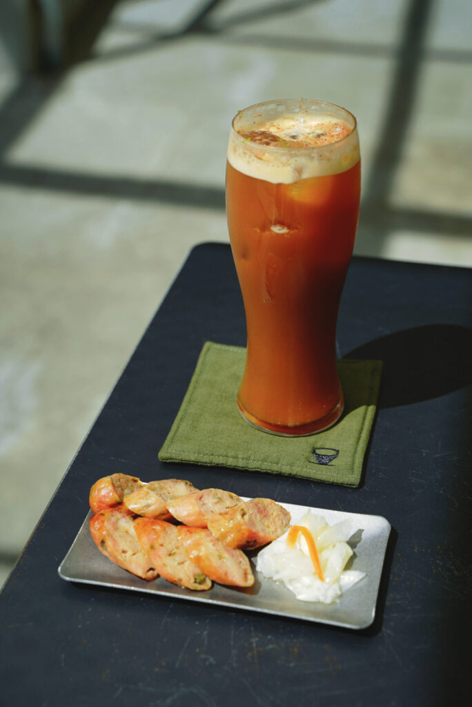 「我要一杯台式西西里,一份剝皮辣椒雞肉腸。」前面的客人對著吧台的咖啡師點餐。
