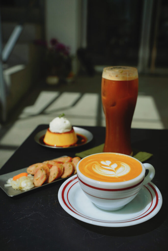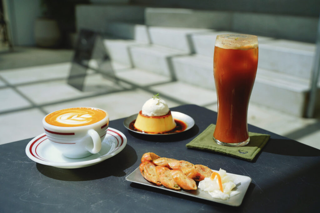 採訪尾聲,我在店裡喝著果香系的淺焙卡布搭配有著苦甜焦糖的硬布丁,再來組清爽的台式西西里搭配一點點微辣的剝皮辣椒雞肉腸。