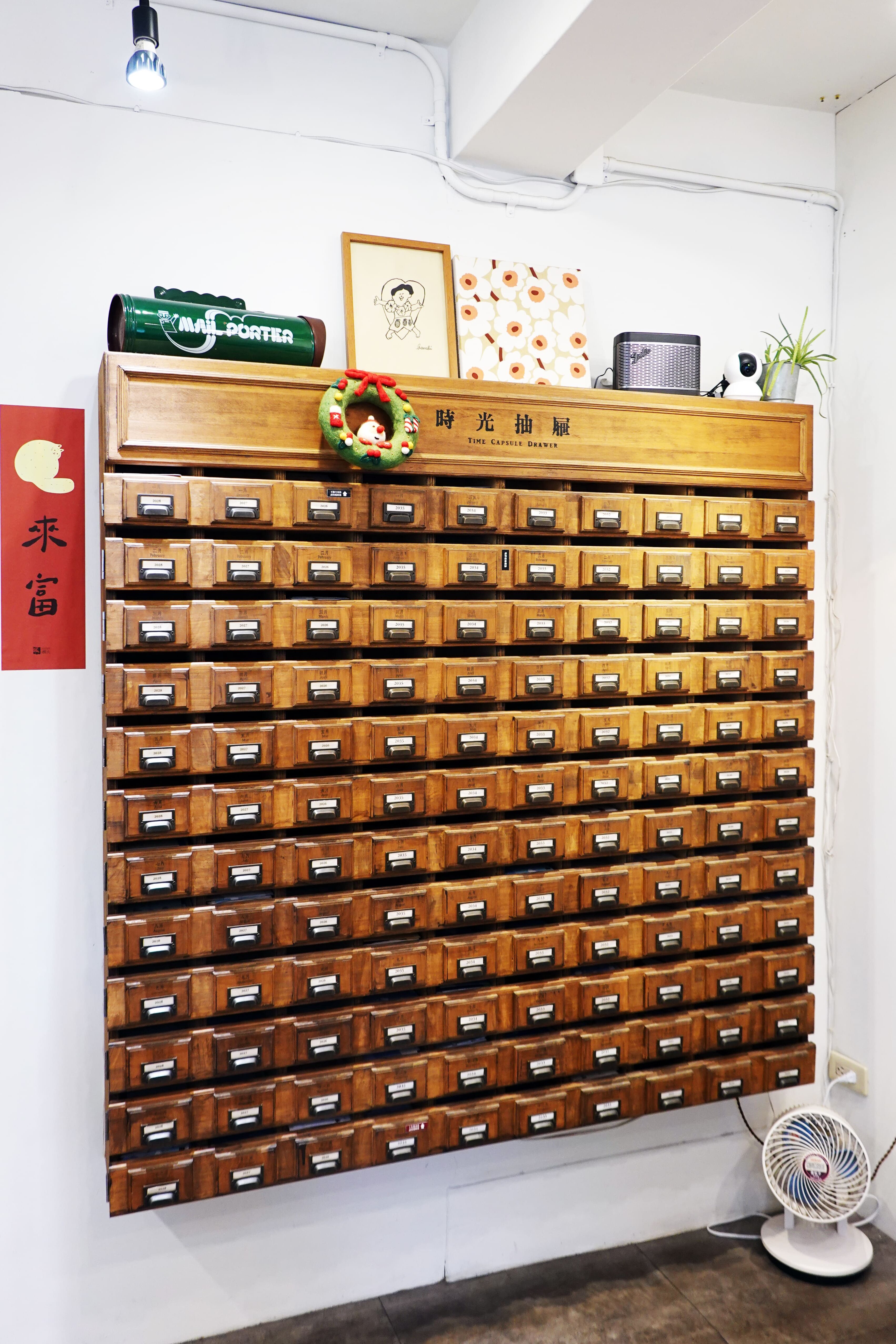 其中最值得介紹的不外乎是店內的主視覺「時光抽屜」!最初,空間僅提供書寫與代寄服務,直到客人提出「能不能一年後再寄?」、「三年後還可以嗎?」等請求,才意外催生出「時光抽屜」的誕生。
