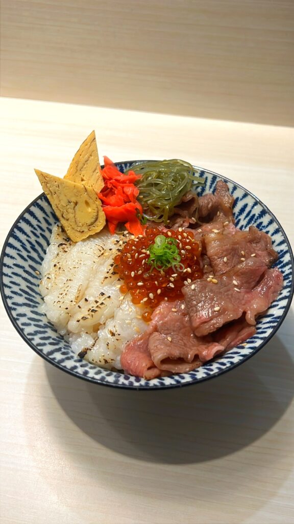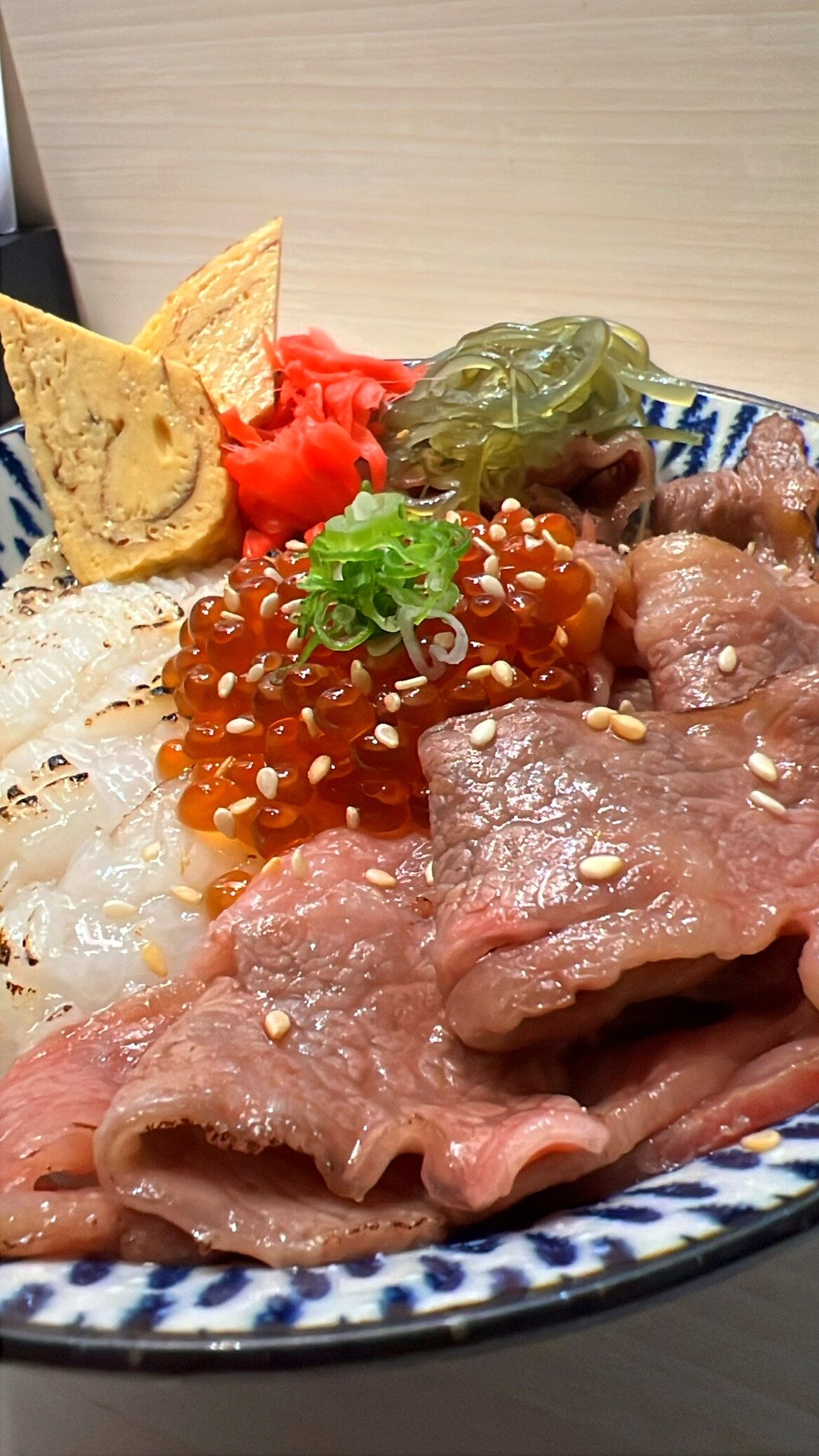 比目魚的油質搭配上安格斯牛小排的油質,融合在醋飯裡,再淋上鮭魚卵,口感爆擊,入口層次豐富,組合而成的一碗奢華又滿足的海陸丼飯。