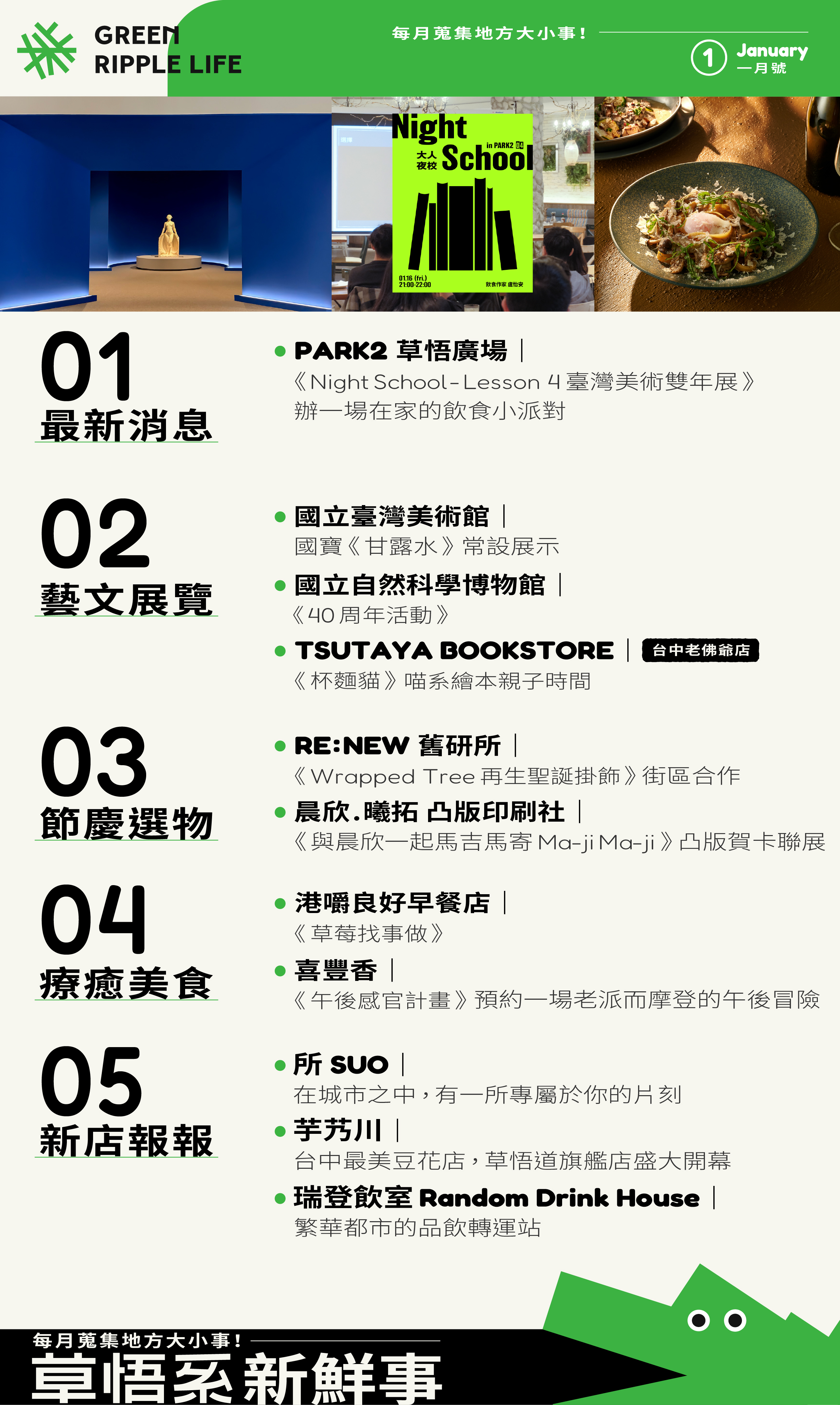 打造草悟道理想的生活樣貌為使命;致力於串聯街區店家、社區鄰里以及喜愛草悟道生活的群眾,凝聚區域共創共榮的循環善意,為草悟道注入更精彩的發展能量。 Mail:lifeingreenripple@gmail.com