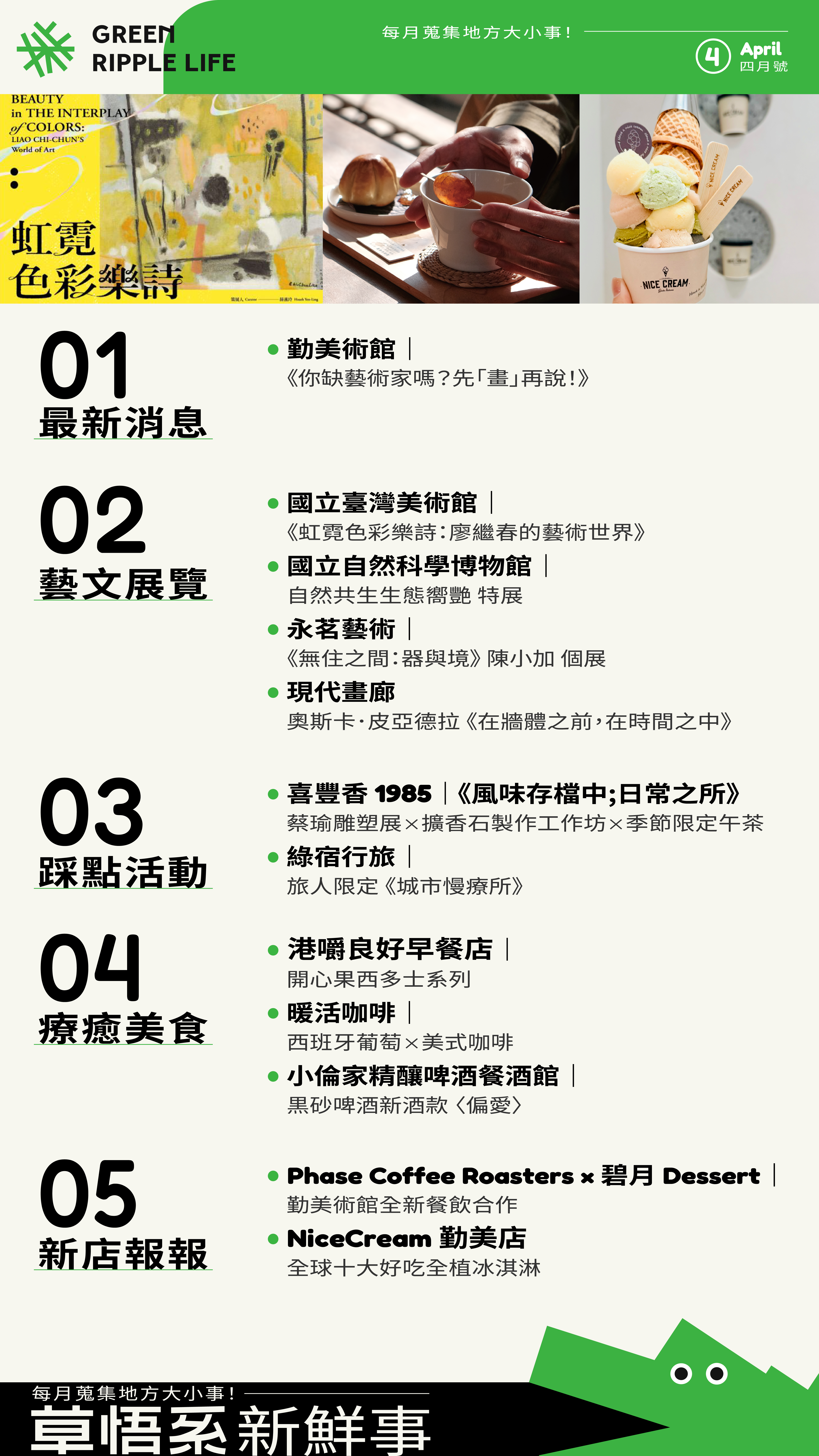 交織美學及味蕾的全新茶敘氛圍。《你缺藝術家嗎?先「畫」再說!》春季新展、喜豐香1985 ×《風味存檔中;日常之所》蔡瑜雕塑展、Phase Coffee × 碧月 勤美術館店現正試營運中。